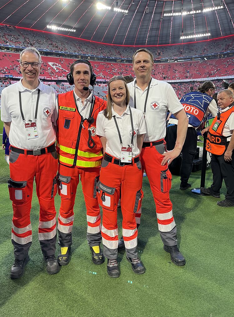 Jeder kennt die Allianz Arena, aber nur wenige wissen, wie der Sanitätsbereich dort aussieht. Unser Dienst beginnt in der Regel bereits 1,5 Stunden vor dem Spiel. Als Team machen wir uns gemeinsam auf den Weg von Pasing zur Allianz Arena, wo wir unsere Schlüssel und das notwendige Material erhalten.
