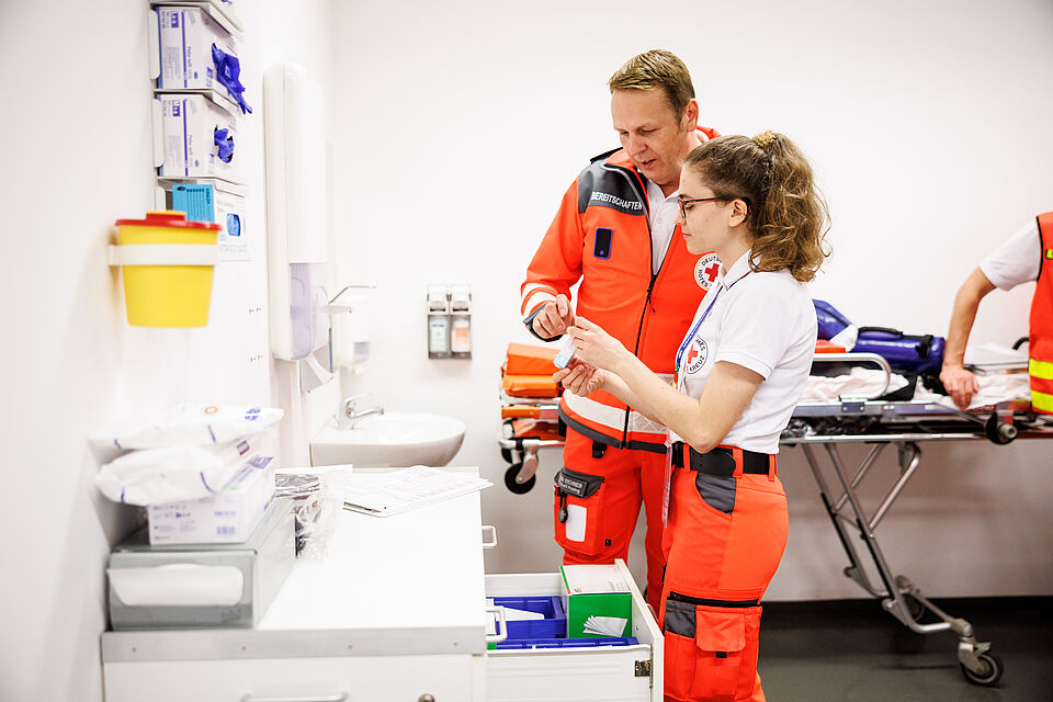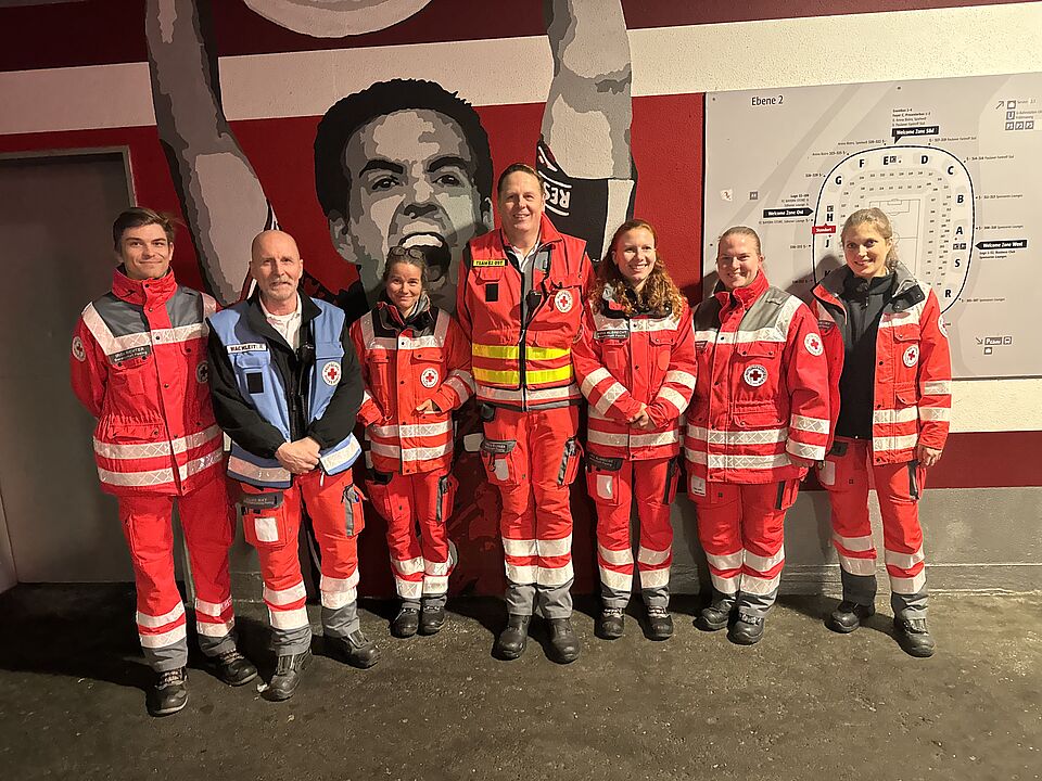 Wenn wir in der Wache sind, besteht unser Team aus mindestens sieben Personen. Um eine Wache in der Arena zu besetzen, sind verschiedene Qualifikationen erforderlich, darunter Sanitäter, Rettungssanitäter, Truppführer und Gruppenführer. Am Spielfeldrand hingegen sieht es etwas anders aus: Hier reichen zwei Fachsanitäter und ein Rettungssanitäter, die gemeinsam mit ihrem Truppführer direkt am Spielfeldrand postiert sind.